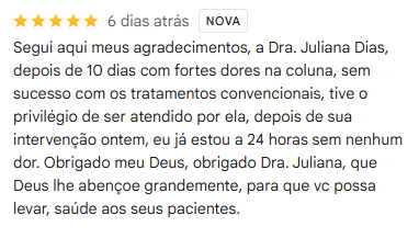 Sou a Dra. Juliana Dias e minha atuação é voltada para o cuidado da dor com escuta, clareza e acompanhamento. Tenho Residência em Anestesiologia e sigo aprofundando minha prática com Especialização em Tratamento da Dor pela USP, Pós-graduação em Intervenção em Dor e formação em Medicina Endocanabinoide.